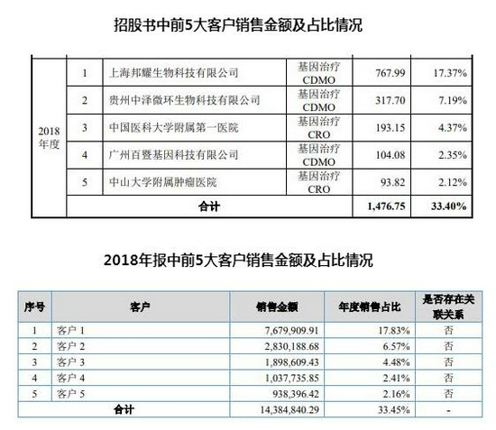 招股书显示,2018年公司前5大客户合计销售金额为1476.75万元,销售占比为33.4%,而年报中该金额为1438.48万元,较招股书减少38.27万元,比例却增加0.05%至33.45%。