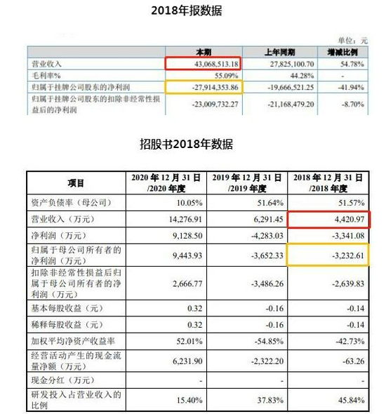 需要注意的是,和元生物招股书多个数据与2018年新三板年报存在出入。2018年新三板年报显示,公司营业收入为4306.85万元,归母净利润为-2791.44万元。而招股书中,2018年营收为4420.97万元,比年报中多出114.12万元,归母净利润为-3232.61万元,比年报多亏损441.17万元。