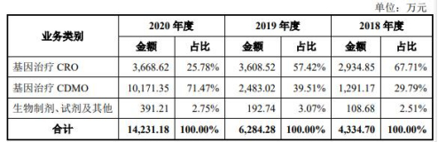 和元生物聚焦基因治疗领域,主要业务可分为基因治疗CRO、基因治疗CDMO及生物试剂等业务。招股书显示,和元生物自成立至2015年,以CRO业务为主,2016年开始布局CDMO业务,2019年以来,CDMO业务进入高速成长期。