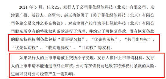 此外还对京津冀产投作为菲仕绿能科技(北京)有限公司股东所享有的特殊权利条款进行了清理,并约定了可恢复条款,附有恢复条款的股东特殊权利条款包括“董事提名权”、“优先购买权”、“共同出售权”、“优先认购权”、“收购选择权”、“回购权”等权利。