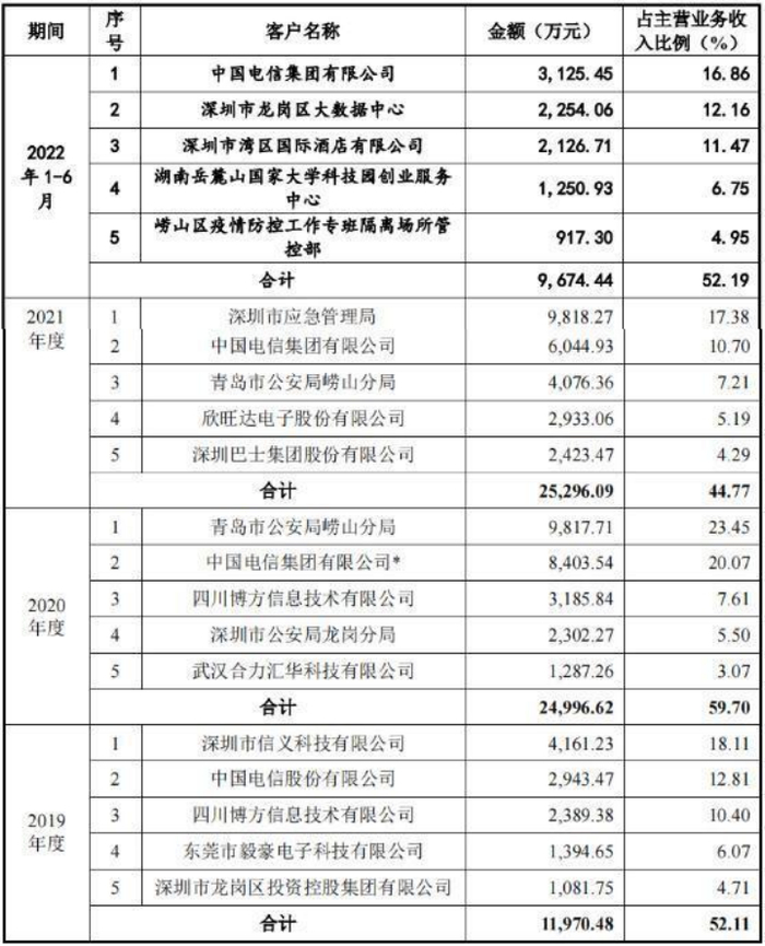 在报告期各期云天励飞的主要客户变动方面,前五大客户的销售金额合计占主营业务收入比例分别为52.11%、59.70%、44.77%及52.19%,客户集中度较高。