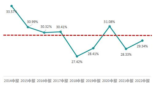 图1:2014-2022年中报A股中药企业资产负债率中位数变化