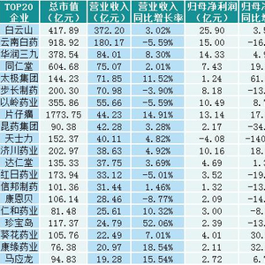 表1:A股中药企业2022年中报营业收入TOP20企业