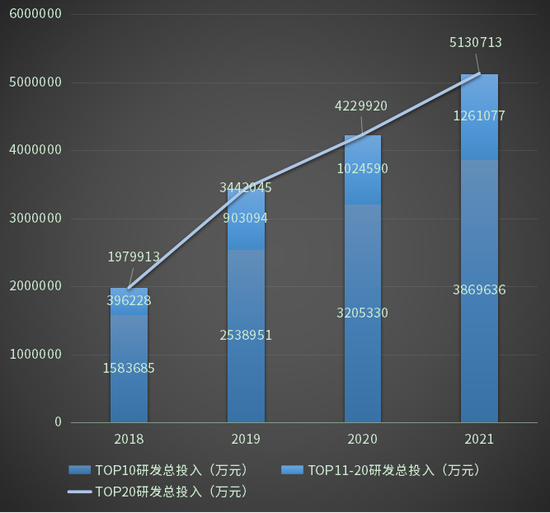 从研发投入费用来看,TOP50企业研发总投入从2018年的248.9亿元增至2021年的702.5亿元,增长了282%。其中TOP20企业研发总投入从2018年的198亿元增长到2021年的513亿元,涨幅259%;而排名21-50位的企业研发总投入四年间增长超过300%。