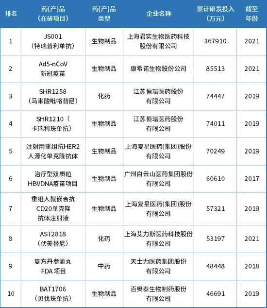 在国内上市的药企中,研发投入最多10个产品中有7个为抗肿瘤药,排名第一的是君实生物的PD-1单抗特瑞普利单抗,截至2021年已投入36.79亿元,一骑绝尘,远超第二位的康希诺新冠疫苗——8.55亿元。