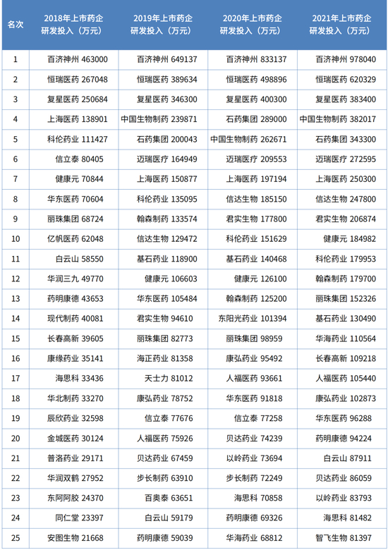 (详见文末附表:2018年-2021年中国上市药企研发投入TOP50)