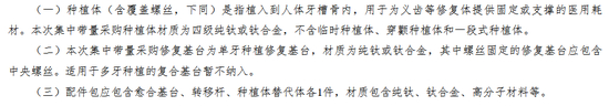 本次带量采购的品种包括以种植体、修复基台、配件包各1件组成种植体产品系统,并根据种植体材质,分为四级纯钛种植体产品系统和钛合金种植体产品系统共两个产品系统类别。