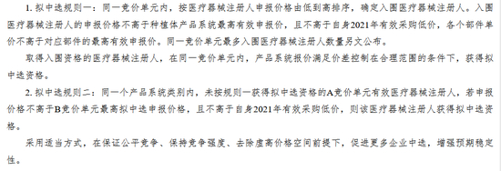 根据《公告》,各竞价单元内医疗器械注册人以产品系统开展竞价,通过价格竞争产生拟中选企业,拟中选规则有两个: