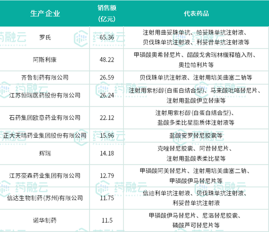 据药融云统计,2021年抗肿瘤药物院内市场销售额总计超885亿元,同比增长13%,2022年也在稳定增长。从企业来看,TOP10药企中跨国企业有4家,分别为罗氏、阿斯利康、辉瑞和诺华制药,本土药企有6家,分别为齐鲁制药、江苏恒瑞、石药欧意、正大天晴、江苏豪森和信达生物。具体情况见下表。