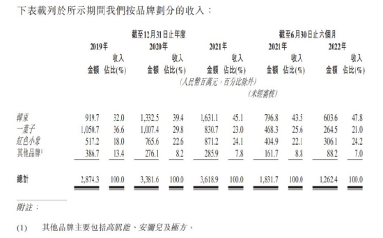 其中,韩束为主力品牌,截至2022上半年,营收贡献占比为47.8%。而一叶子增长乏力、收入占比在逐年下降。