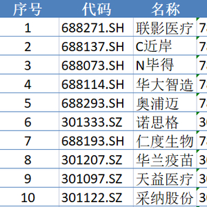 按发行价格计,联影医疗、C近岸、N毕得、华大智造、奥浦迈、诺思格、仁度生物、华兰疫苗、天益医疗和采纳股份为排名前十的医疗企业,发行价分别109.88元/股、106.19元/股、88.00元/股、87.18元/股、80.20元/股、78.88元/股、72.65元/股、56.88元/股、52.37元/股和50.31元/股。