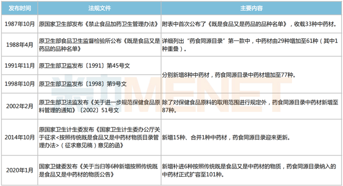 据不完全统计,自1987年起,国家有关部门已陆续更新了至少6版药食同源目录,截至目前,药食同源目录纳入的中药材已超过100种。(文末附:历年来药食同源目录梳理汇总)