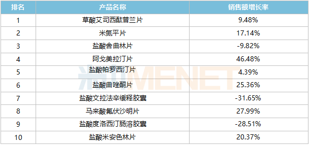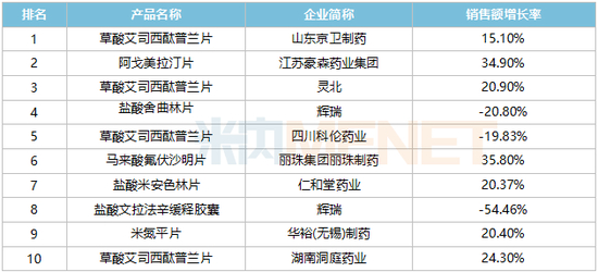 品牌TOP10中,有4个的销售额超过2亿元,前三的山东京卫制药的草酸艾司西酞普兰片、江苏豪森药业集团的阿戈美拉汀片、灵北的草酸艾司西酞普兰片销售额增速均超过15%,辉瑞的盐酸舍曲林片则下滑20.90%。