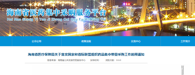 9月28日,海南省医保局发布《关于落实国家和省际联盟组织药品集中带量采购工作的预通知》。