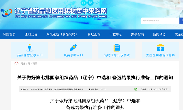 10月24日,辽宁省医保局发布《关于做好第七批国家组织药品(辽宁)中选和备选结果执行准备工作的通知》。