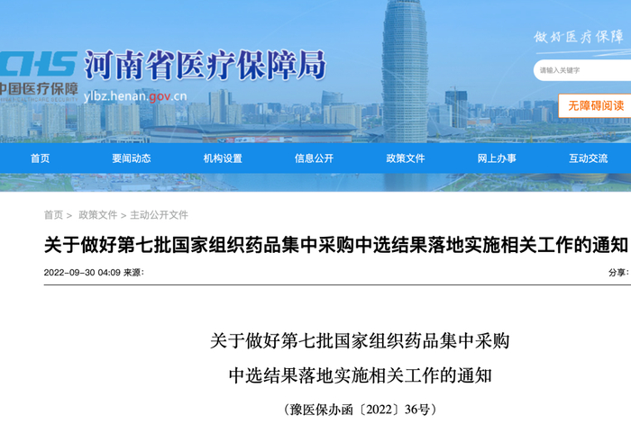 9月30日,河南省医保局发布《关于做好第七批国家组织药品集中采购中选结果落地实施相关工作的通知》。