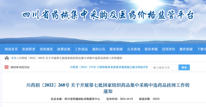 10月19日,四川省药械招标采购服务中心发布《关于开展第七批国家组织药品集中采购中选药品挂网工作的通知》,要求企业在四川省药械集中采购及医药价格监管平台维护企业、产品资质信息,截止时间为2022年10月25日。