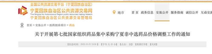 10月21日,宁夏回族自治区公共资源交易服务中心发布《关于开展第七批国家组织药品集中采购宁夏非中选药品价格调整工作的通知》,开展第七批国家组织药品集中采购宁夏非中选药品价格调整工作。