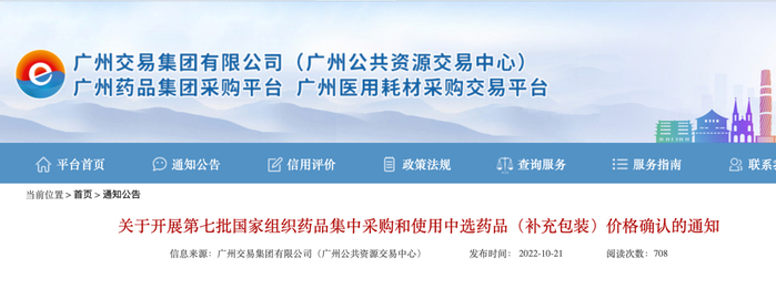 10月21日,广州公共资源交易中心发布《关于开展第七批国家组织药品集中采购和使用中选药品(补充包装)价格确认的通知》,要求有关单位在2022年10月26日17时前登录广州药品集团采购平台,进入“分类采购”子系统“信息公示及公布”模块进行价格确认工作。
