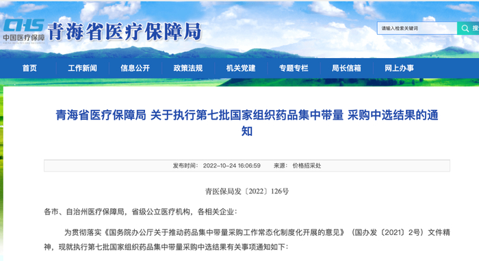10月24日,青海省医保局发布《关于执行第七批国家组织药品集中带量采购中选结果的通知》。