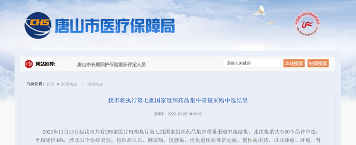 10月22日,唐山市医保局发布《我市将执行第七批国家组织药品集中带量采购中选结果》的通知,明确指出,2022年11月15日起唐山市共有288家医疗机构执行第七批国家组织药品集中带量采购中选结果。