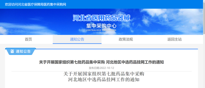 10月12日,河北省医用药品器械集中采购中心发布《关于开展国家组织第七批药品集中采购河北地区中选药品挂网工作的通知》,要求相关药品生产企业完成资质、价格申报工作。逾期未申报的视为自愿放弃本次挂网资格。