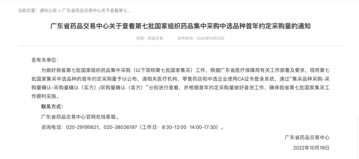 10月19日,广东省药品交易中心发布《关于查看第七批国家组织药品集中采购中选品种首年约定采购量的通知》,公布了第七批国家集采中选品种的首年约定采购量,要求相关医疗机构、零售药店和中选企业分别进行查看,并根据首年约定采购量做好备货工作。