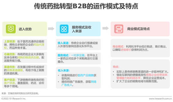 传统药批转型B2B可以看做是卖方主导,经营主体多为医药流通和批发企业,这类企业通常拥有众多上游厂商的药品代理权,有自己的实体仓库和经销渠道,天然具有进入医药电商领域的逻辑。药批企业为了扩大医药产品的销售范围,自然选择利用网络平台进行上游供应商与下游客户的需求对接与关系管理,从接入互联网入口、搭建信息化平台开始,传统药批企业快速切入线上渠道,进行医药电商B2B平台的研发与利用。