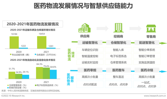随着医药流通的不断发展,医药物流技术水平不断提高,2021年医药物流企业运输车辆达16454辆,仓库面积1261万平方米。同时,医药物流供应链技术与服务实现全面升级,智能温度控制、电子标签拣选、智能订单管理等技术实现了医药物流的信息化、智慧化;医药零担、医药整车、医药冷链等服务模式更加契合市场药品运输需求,共同助力医药电商B2B提高药品物流与配送能力,通过智慧化运输、仓储与专业化配送实现药品的快捷、高效流转,进而更好地迎合药品流通需求。