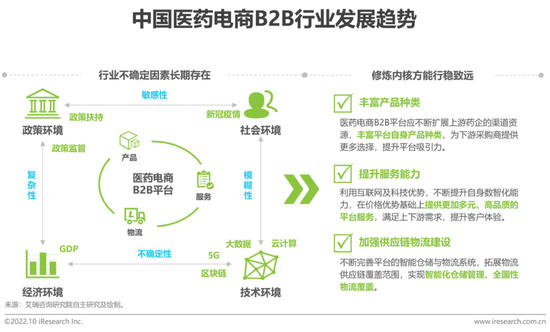 中国医药电商B2B行业正处于高速发展阶段,疫情的物理阻隔为线上购药奠定了习惯基础,处方外流等政策激发院外市场的购药需求,这些为行业发展提供了有利条件。但除此之外,宏观环境尚不稳定,未来严肃医疗趋势下政策监管如何变化,疫情如何走向,新技术如何应用等目前尚无明晰的方向,行业发展的不确定性因素将长期存在。在这一背景下,医药电商B2B平台应注重提升自身,从丰富产品种类,提升服务能力,加强供应链物流建设等方面不断修炼内核,如此方能行稳致远。
