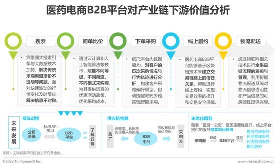 医药电商B2B平台凭借其深厚的技术积累与技术能力,优化平台采购的全链路流程,为下游买家提供一站式采购解决方案,实现智能采购。平台从商品搜索、询单比价、下单采购、线上履约直至物流配送各个方面,依靠大数据、区块链和物联网等技术,帮助采购商实现采购信息透明化、产品服务推荐定制化、签约流程线上化以及溯源信息可靠化等。未来平台将凭借其科技优势继续渗透采购环节,在系统对接充分、供应链金融可靠、本地化服务完善等方面持续发力,为企业赋能。