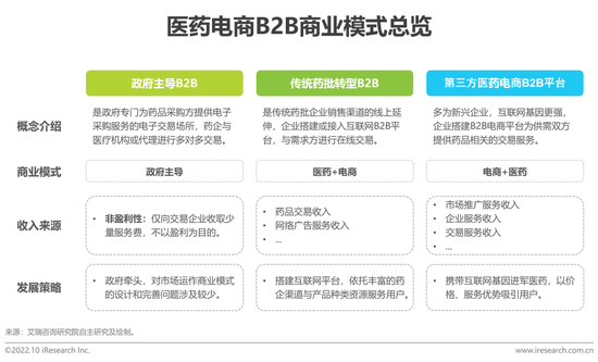 近年来,医药电商B2B模式呈现出交易体量持续增加、参与主体日趋多样、商业模式崭露差异的特点。除了政府主导的医药电商B2B模式之外,其余两种模式主要面向的终端市场与产品体系各有差异。传统药批转型B2B资金链稳健、供货和仓储能力强,依托自身积累更多服务医院、大型连锁药店等终端,产品种类除了处方/非处方药之外,也提供医院集采所需药品,品种品牌更为集中,药品安全性较强。第三方医药电商B2B平台作为新进入医药领域的电商平台,以其价格、服务优势主攻诊所、单体药店等下沉市场,其产品多为处方/非处方药,种类更为丰富,性价比更高。