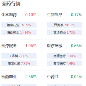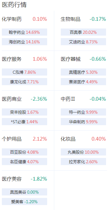 个股方面,百奥泰20cm涨停,特一药业、华森制药、丸美股份涨停。奕瑞科技、大参林、益丰药房、启迪药业跌幅居前。