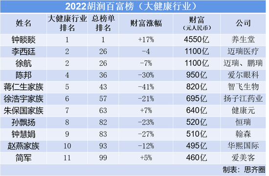 来自迈瑞医疗的李西廷和徐航,个人财富分别减少4%和7%,以1100亿元并列行业第二名。爱尔眼科的陈邦个人财富同比下降30%,以950亿身家位居行业第四名。