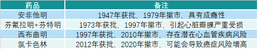 据不完全统计,FDA已经批准十多款减肥药,但有较多药品存在较为严重的副作用而撤市,目前主要的减肥药大概有6种,其中司美格鲁肽减重效果最佳,GLP-1受体激动剂也是未来减肥药的主流药效机理模式。