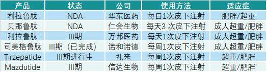 其中塞美拉肽针对罕见病,针对6岁以上罕见遗传性肥胖症患者,其他的几款药物均是针对以BMI衡量的肥胖人群,如BMI≥30 或BMI在27-30且存在一种或多种与体重相关的合并症,如2型糖尿病、血脂异常、高血压。