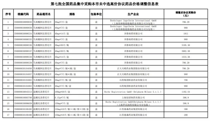 11月18日,上海阳光医药采购网发布《关于第七批全国药品集中采购本市高价协议药品价格调整的通知》,通知自11月22日起执行,涉及45个药品,包括上海市中选及备供高价协议药品和未中选高价协议药品,具体名单如下: