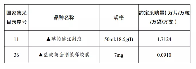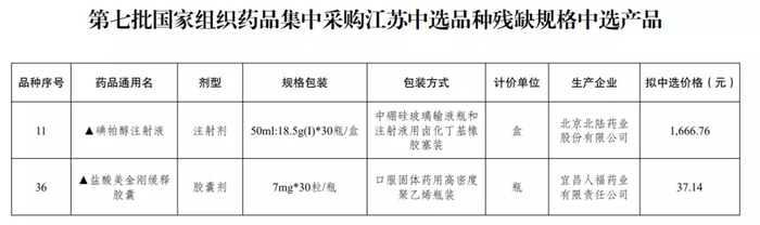 11月18日,江苏省医保局公布《第七批国家组织药品集中采购江苏中选品种残缺规格中选产品》,两个药品中选,分别为北京北陆药业生产的碘帕醇注射液、宜昌人福药业生产的盐酸美金刚缓释胶囊,具体规格、拟中选价格及约定采购量可参考下图。