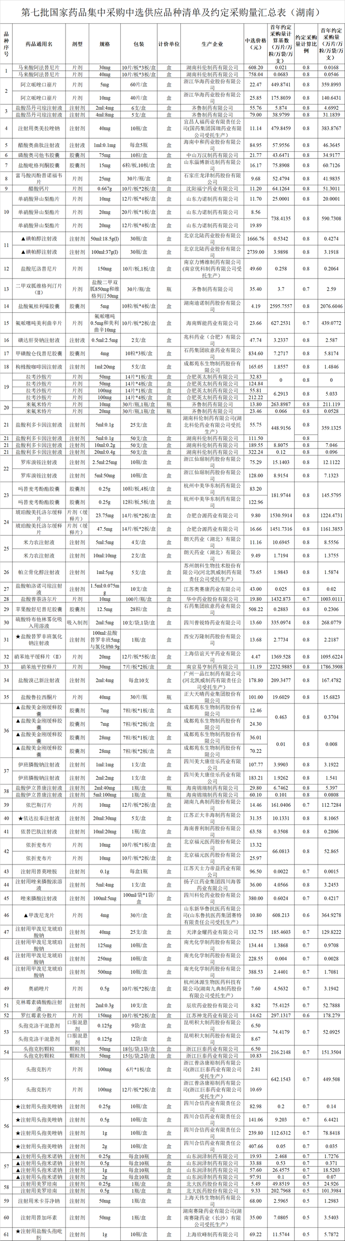 附1:湖南第七批国采中选品种清单及约定采购量汇总表