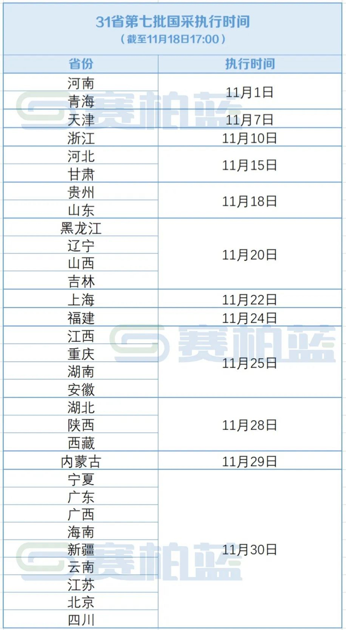 今日(11月18日)下午,湖南、湖北等省公布第七批国采最新文件,至此,31省执行时间已全部确定。