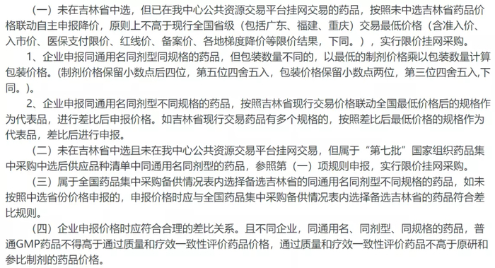 申报企业应在11月24日16:00前,进入招标系统选择项目名称“第七批未中选吉林省药品价格联动”,点击企业投标,并将相应申报的药品进行勾选投标,然后对每个药品逐个进行价格上报,具体价格申报规则如下: