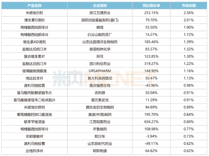 从品牌排名看,TOP18品牌销售额均超过1亿元,其中有10个为国产品牌,浙江万晟药业的米诺地尔酊以2.56%的市场份额摘下桂冠,排名较去年上升5个位次;江苏知原药业的联苯苄唑溶液、四川科伦药业的盐酸达泊西汀片销售增速与同期相比均超过300%,且均属于新上榜品牌。