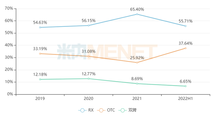 处方药的占比逐年提升,由2019年的54.6%上升至2021年的65.4%,已成为网上药店的销售“主力”,这或许跟网售处方药政策的逐步放开有关。而非处方药在2022上半年销售占比出现回升,主要是中成药方面受到国家政策扶持等影响,大幅刺激了中成药OTC市场需求。