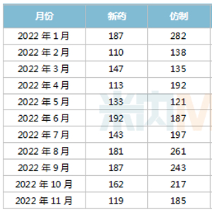 2022年11月,天津红日健达康医药、上海璎黎药业、山东绿叶制药等均有1类新药获批上市。山西振东安欣生物制药的胶体果胶铋颗粒为新剂型获批。默沙东的帕博利珠单抗注射液再获批新适应症。81个仿制药获批上市(含进口5.2类),吡美莫司乳膏(江苏知原药业)、氮䓬斯汀氟替卡松鼻喷雾剂(长风药业)、多种油脂肪乳注射液(C6-24)(费森尤斯卡比华瑞制药)、酒石酸艾格司他胶囊(北京凯莱天成医药)、氯吡格雷阿司匹林片(乐普药业)、氯化钾口服溶液(杭州和泽坤元药业)、山梨醇甘露醇冲洗剂(济民健康管理)为国内首仿品种。26个存量品种有企业过评,复方α-酮酸片、富马酸卢帕他定片、泮托拉唑钠肠溶胶囊、盐酸决奈达隆片、盐酸替罗非班注射用浓溶液、注射用哌拉西林钠等6个存量品种首次有企业过评。