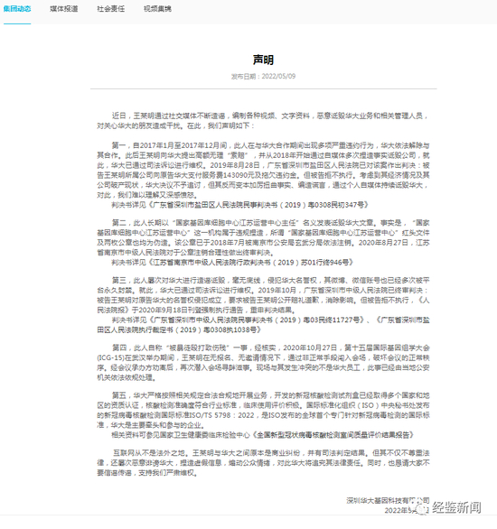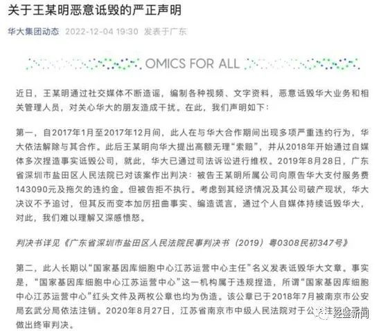 华大基因通过官网发布申明称,自2017年1月至2017年12月间,王某明在与华大合作期间出现多项严重违约行为,华大依法解除与其合作。此后王某明向华大提出高额无理“索赔”,并从2018年开始通过自媒体多次捏造事实诋毁公司,就此,华大已通过司法诉讼进行维权。