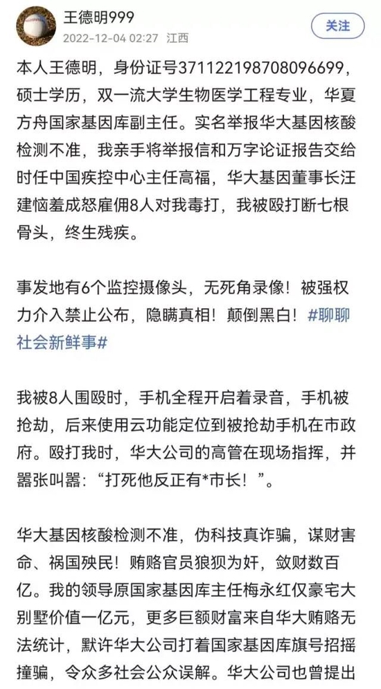 12月4日,一名自称王德明的网友发长文,称自己因实名举报华大基因核酸检测不准,被华大董事长汪建雇佣的8人殴打致残的消息在网络上发酵传播。