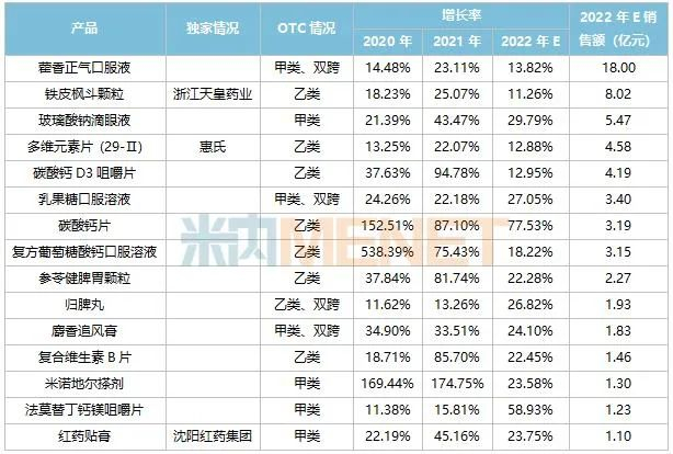2022年预计在中国城市药店终端销售额超过10亿元的OTC药品有12个,化学药占3个,中成药占9个。