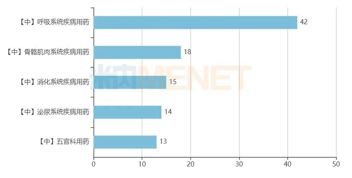 146个中成药OTC药品分布在13个大类,呼吸系统疾病用药数量最多。具体来看,止咳祛痰平喘用药、感冒用药、清热解毒用药3个亚类的数量较为平均,分别为16个、14个、12个,中成药治疗常见病依然备受消费者认可。