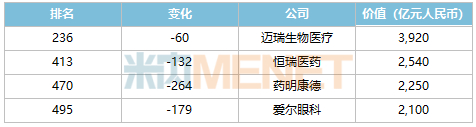 12月9日胡润世界500强对外发布,中国排数量第二,有35家公司上榜。医疗健康排行业第三,共有52家企业上榜。具体来看,强生以32190亿元排在总榜单的第八位,也是医疗健康行业价值最高的公司;中国企业方面,迈瑞生物医疗排在236位,恒瑞医药、药明康德、爱尔眼科排在400位以后。值得关注的是,药明生物、智飞生物今年落榜了,2021年的排名分别是204位、381位。(胡润百富官网)