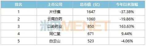 A股中药股市值TOP5